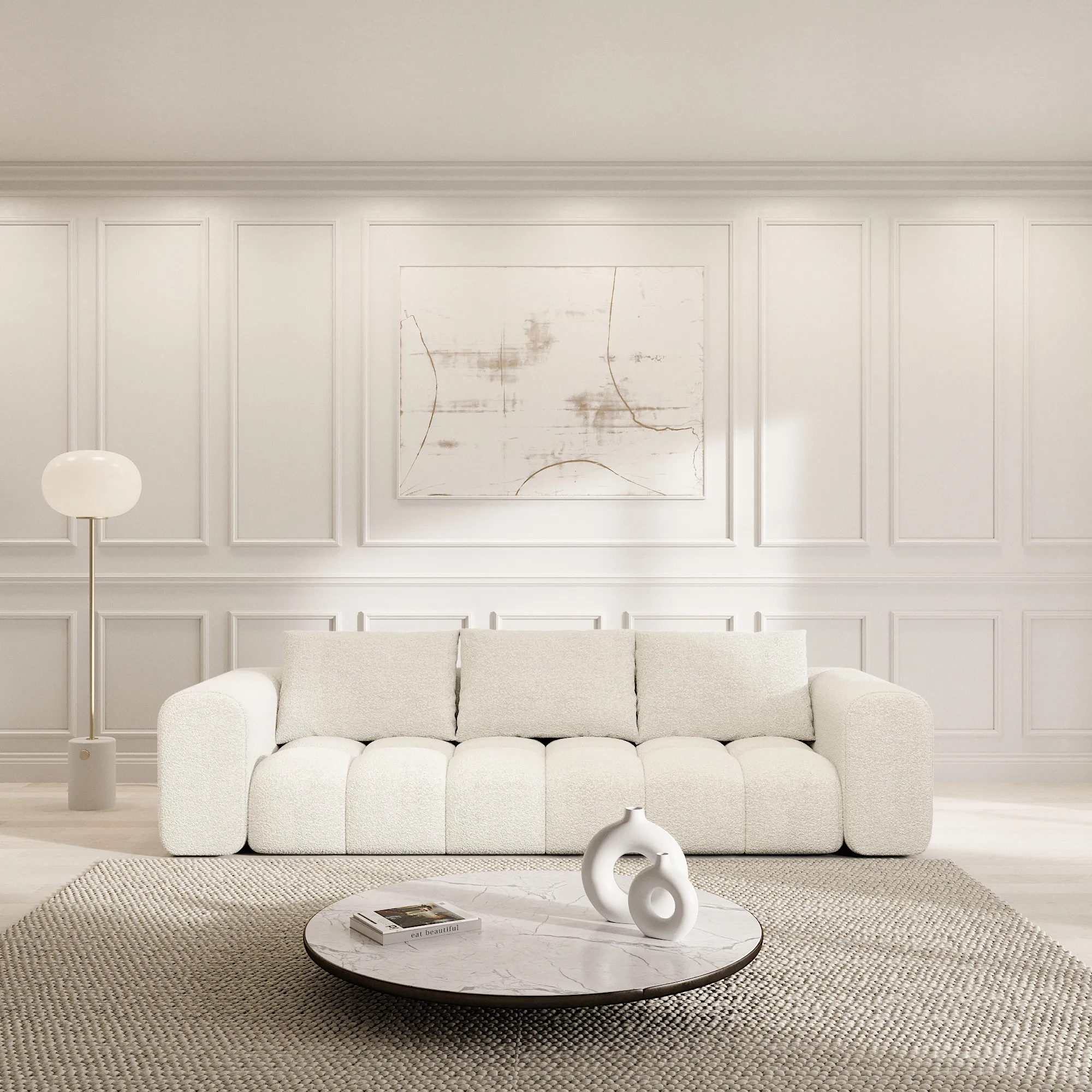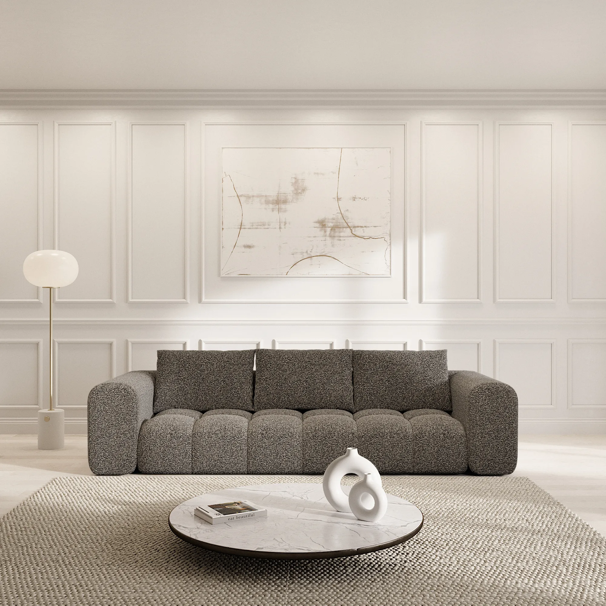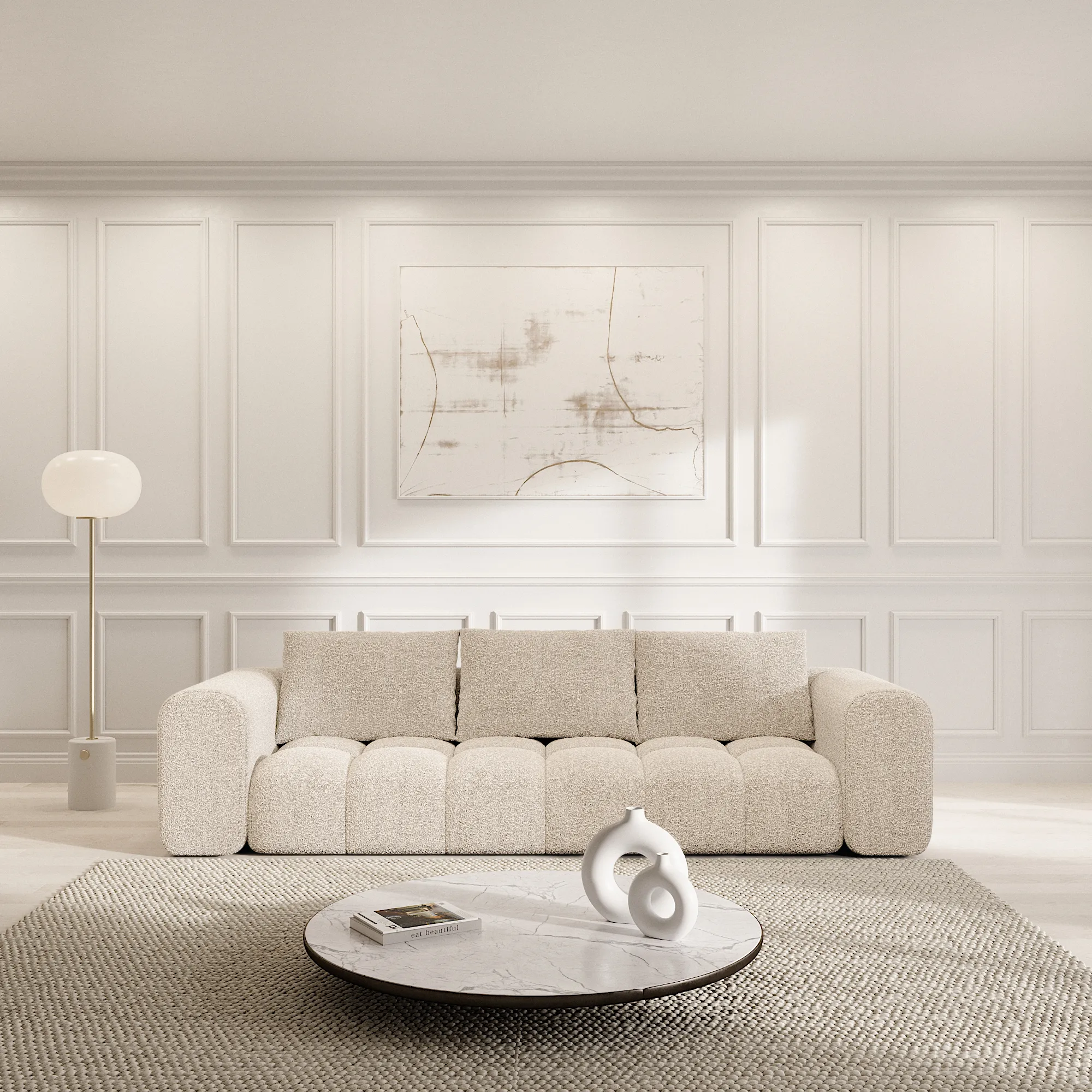Eigenschaft Wert Bezug Bouclé Korpus Hauptkonstruktion aus Buchenholz, mit Spannplatten-Elementen Polsteraufbau Wellenunterfederung, HR-Polyätherschaum (Kaltschaum) Raumgewicht (Schaumstoff) 35 kg/m³ Farbe